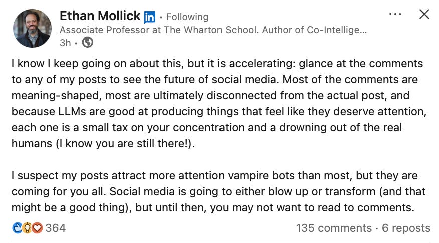 Ethan Mollick1 used a phrase recently that fits quite well this moment in 2026. He was describing the state of comments on his LinkedIn posts: how most of them are now “meaning-shaped.” Not meaningful. Meaning-shaped. Produced by language models that are very good at generating text that feels like it deserves your attention, but on closer inspection has no actual relationship to the post it’s responding to.